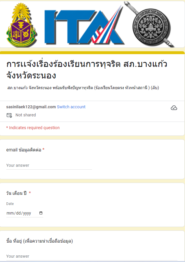 ผ่าน ระบบ google from (รับเรื่องร้องเรียน สภ.บางเเก้ว)